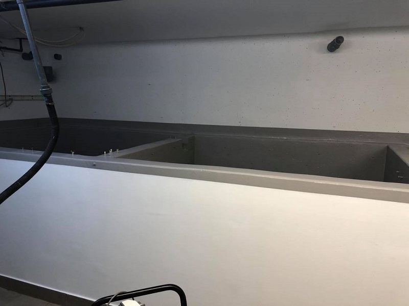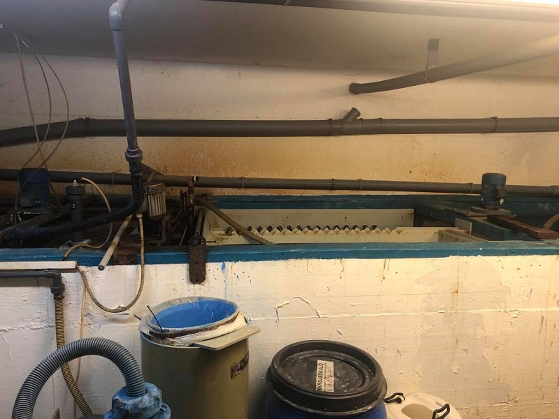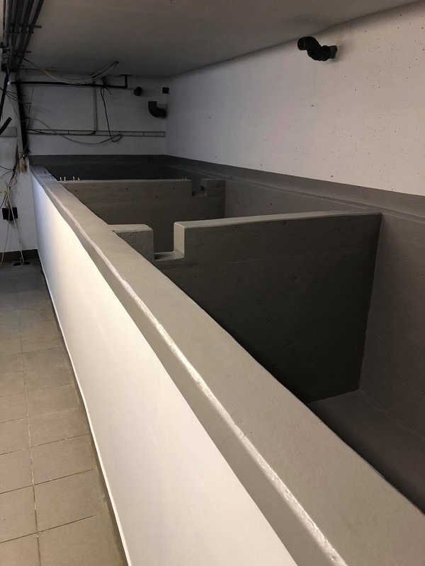 Sanirali so betonske lovilne bazene s kemikaliji v proizvodnji tiskanih vezij. Najprej so odstranili vse stare premaze, beton in kovinsko ograjo zbrusili in ustrezno pripravili. Sanacijo oz. popravilo betona so izvedli s Köster Reparaturno malto NC, fino zagladitev pa naredili s fino sanacijsko malto Köster C-Coat. Za mehansko začito in utrjevanje betona so nanesli en sloj Köster Bridecoat-a. V tem primeru so ga uporabili kot vezni sloj oz. predpremaz. Nato sta sledila dva nanosa izdelka Köster PS Flex, kateri je zagotovil fleksibilno kemično in mehansko zaščito rezervoarja.Kovino so zaščitili s Köster Corrosion Protection.Stene so prebarvali s Köster Silikonsko belo barvo - katera zaradi svoje paropropustnosti omogoča, da so stene še vedno difuzijsko odprte, vodoneprepustnost barve pa omogoča uporabniku, da stene lahko čisti z vodo.
