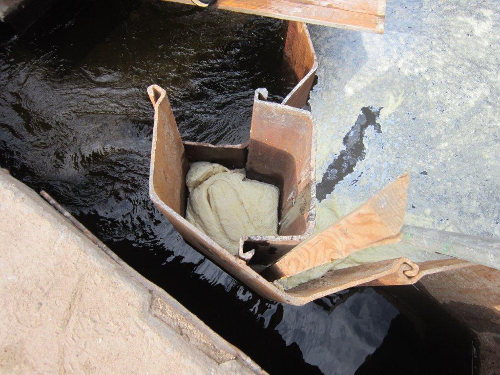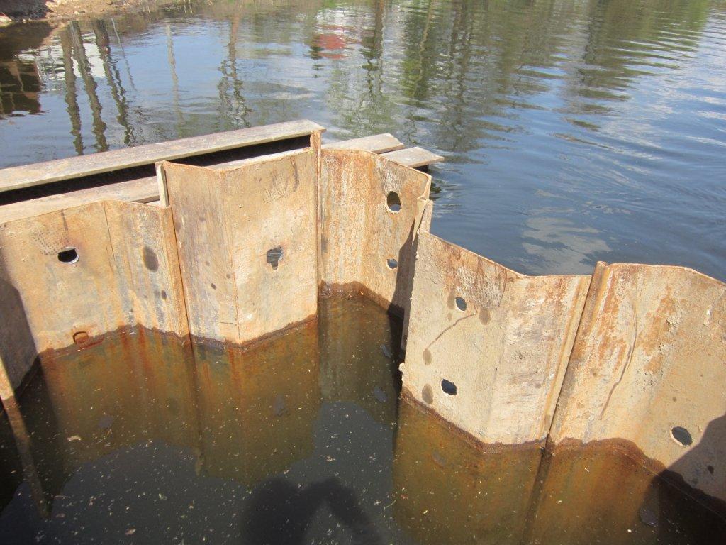 Waterproofing of steel sheet pilings during construction of bridge.