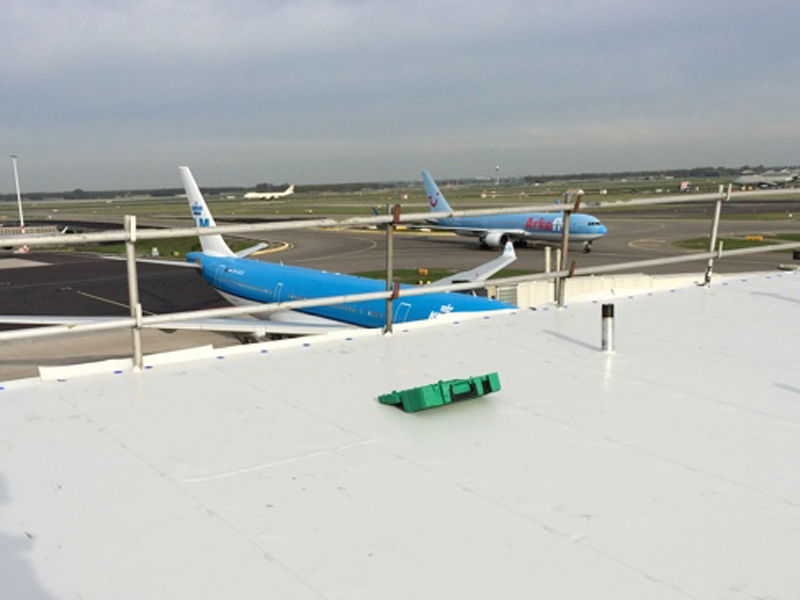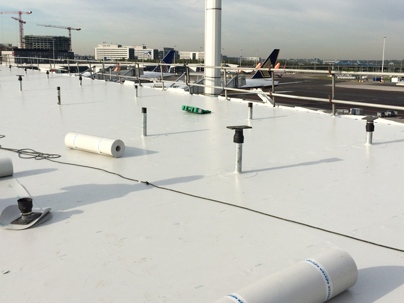 Ein sehr spezielles Projekt: Am Flughafen Schiphol wurden Flachdächer auf einer Fläche von 50.000 m² mit KÖSTER TPO Dachbahnen abgedichtet. Das besondere dabei, die Dachbahnen wurden auf sogenanntes Foamglas montiert. Diese einzigartige Anwendung ist die erste ihrer Art auf der Welt.