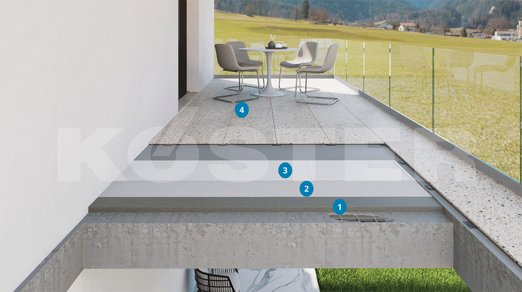 After the concrete substrate is renovated KÖSTER TPO can be installed with a additional fleece protection layer or directly on an isolation without any primer. For waterproofing the area KÖSTER TPO is loose-laid. With a width of up to 2.1 m, a very fast application is possible. If the waterproofing is applied vertically onto a wall, the waterproofing membrane is mechanically fixed in transition. For every single possible detail in balconies and terraces KÖSTER TPO has the right accessory in the product range.