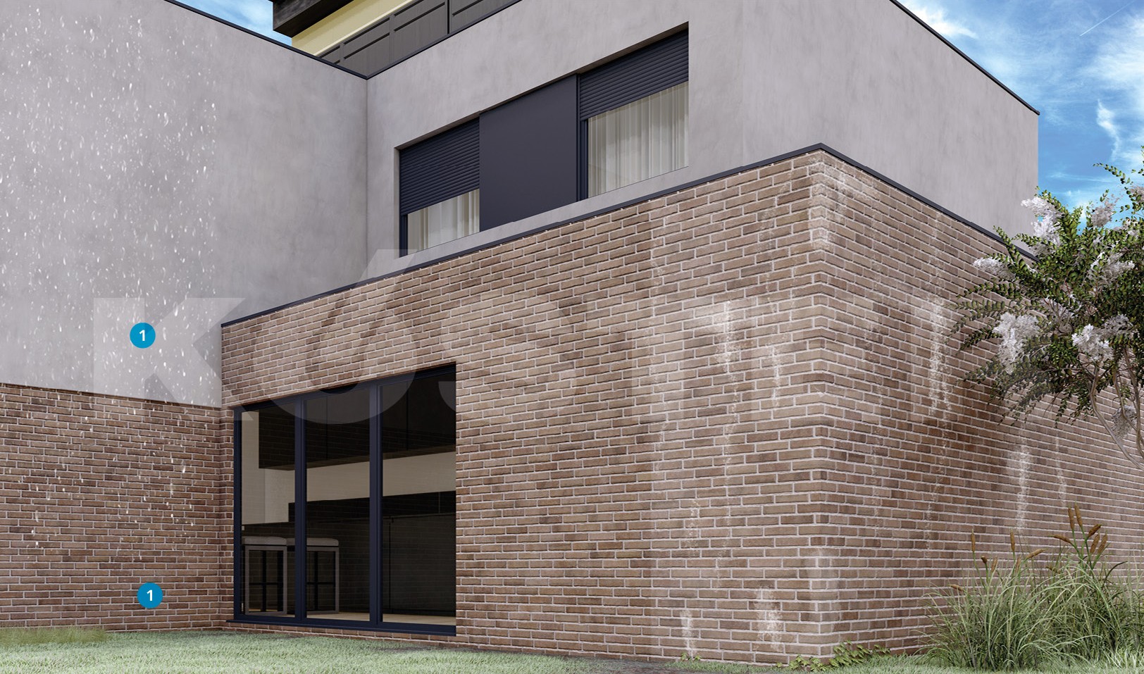 KÖSTER façade protection systems prevent masonry and concrete from liquid water ingress (rain or splash water, condensate), but at the same time water vapor is still able to escape from the façade. That way, long term moisture damage can be avoided.
