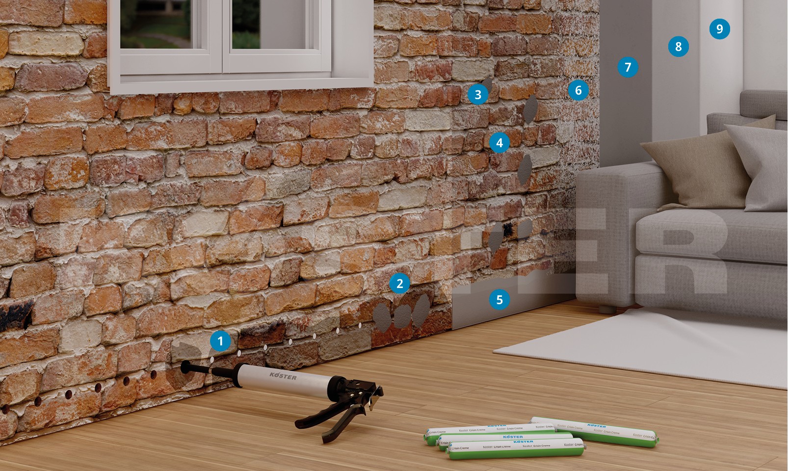 In cases where damage is caused by rising moisture, the old plaster has to be removed from the wall. After the installation of the horizontal barrier, the application of KÖSTER Restoration Plaster is required. The KÖSTER Restoration Plaster allows the masonry to dry without damage. KÖSTER Restoration Plasters are open to vapor diffusion and are hydrophobic. Salts remaining in the wall are absorbed by the KÖSTER Restoration Plasters so that salt doesn’t effloresce to the surface and doesn’t cause damage to the plaster or paint.