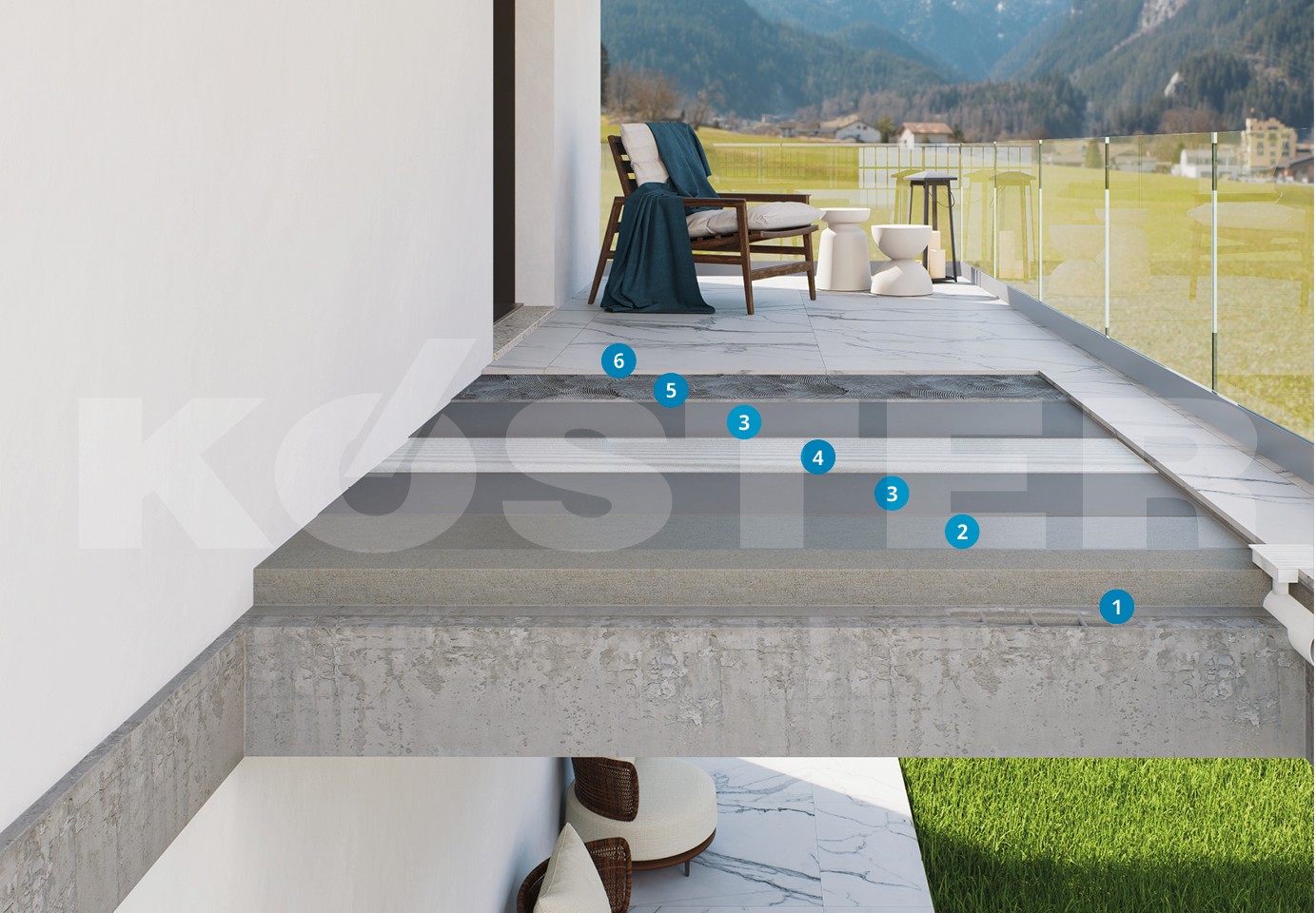 The mineral waterproofing of balconies and terraces is carried out with crack-bridging systems such as KÖSTER NB 4000, KÖSTER NB Elastic Grey, or KÖSTER 21. These waterproofing materials can be walked on and covered with tiles, and they also adhere excellently to damp substrates.