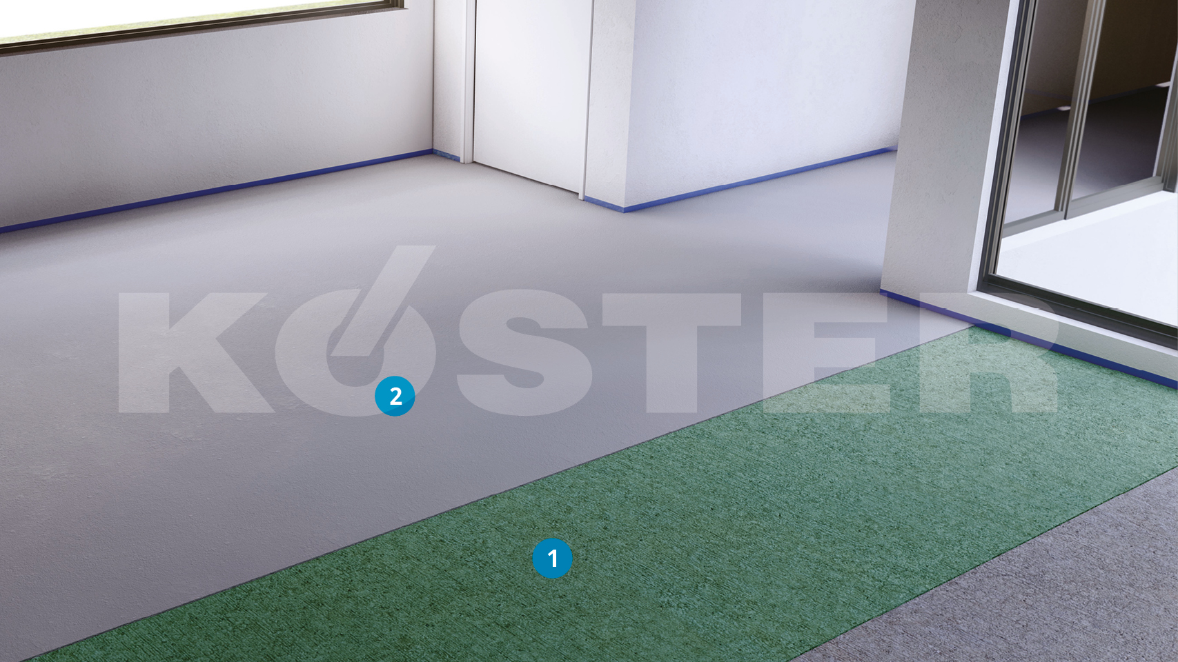 In order to achieve excellent bonding to the following underlayment, the prepared mineral substrate is primed with KÖSTER SL Primer. KÖSTER SL Primer works as a bonding agent to provide a homogeneous absorbency and to bind residual dust. KÖSTER SL Primer cures rapidly and is quickly recoatable.