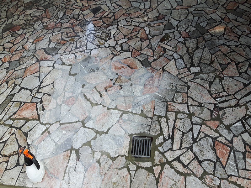 Sanacija in zalivanje odstoplih tlakovcev, zaščita in izdelava paropropustne hidrofobne impregnacije celotnega dvorišča.