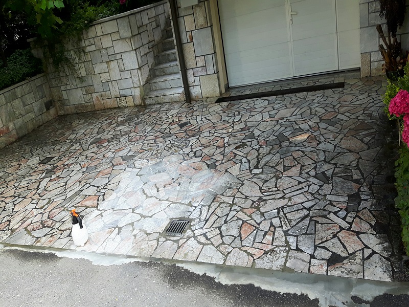 Popravilo, zalivanje, odstoplega porfida/naravnega kamna na dvorišču stanovanjskega objekta, ter paropropustna zaščita celotnega dvorišča. Najprej je bila celotna površina dobro očiščena in pripravljena za nadaljnje delo. Porfidne plošče, katere so odstopili so zalili/podlili in utrdili visoko razlivno in po 3h povozno zalivno malto visoke trdnosti - Köster VGM Fast. Nato so celotno dvorišče zaščitili s Köster Siloxan-om, tekočo hidrofobno impregnacijo za mineralne površine. Siloxan globoko penetrira v podlago, jo zaščiti, ter hkrati ne spreminja videza podlage.