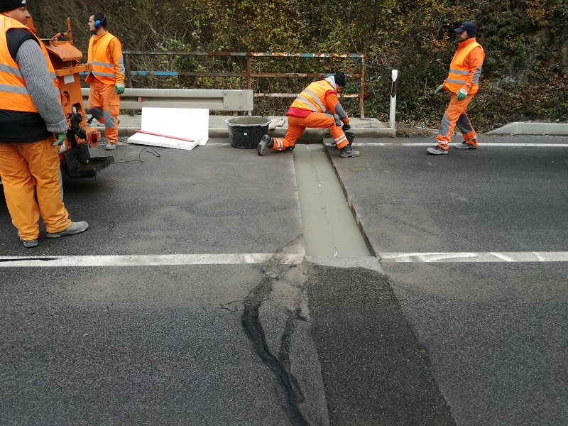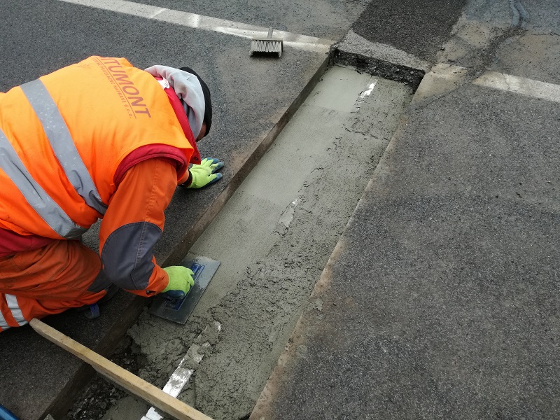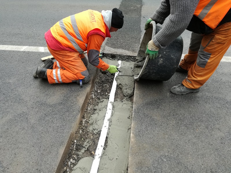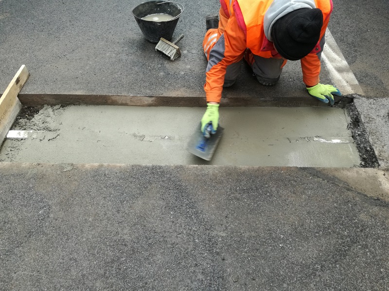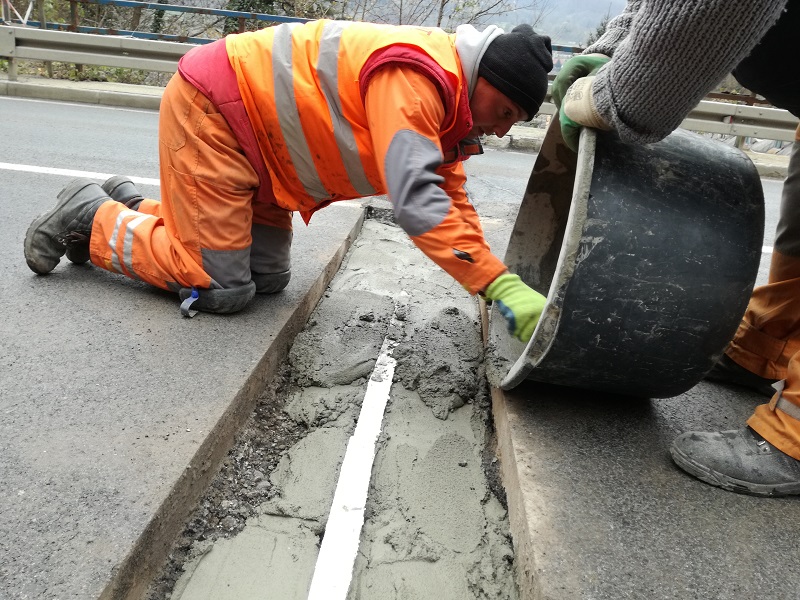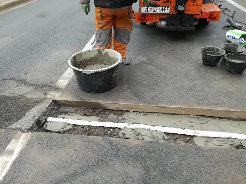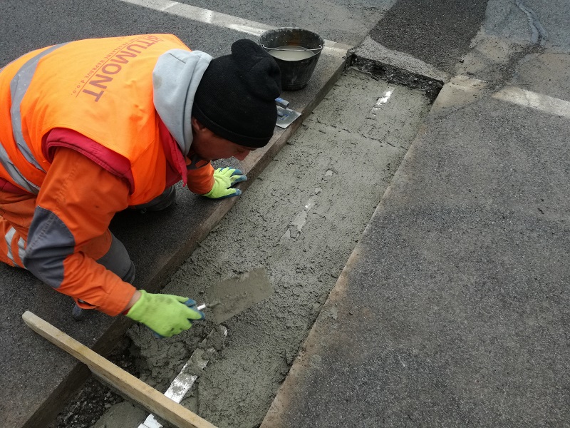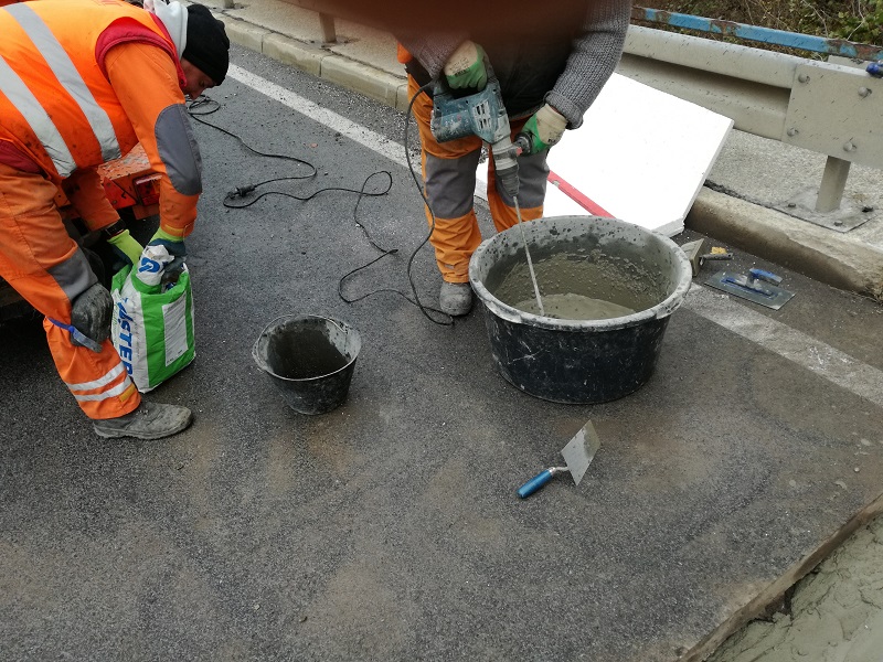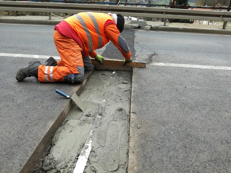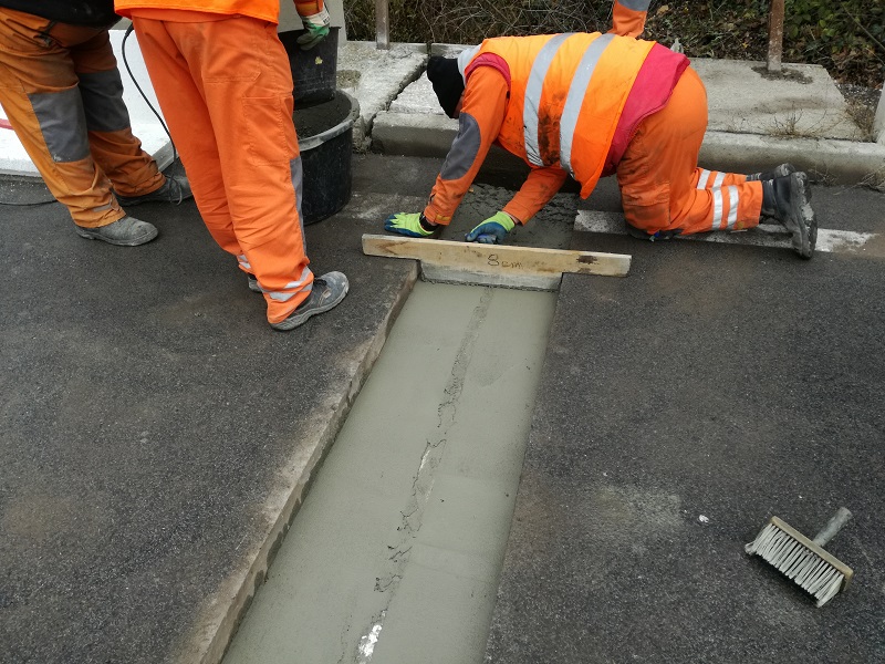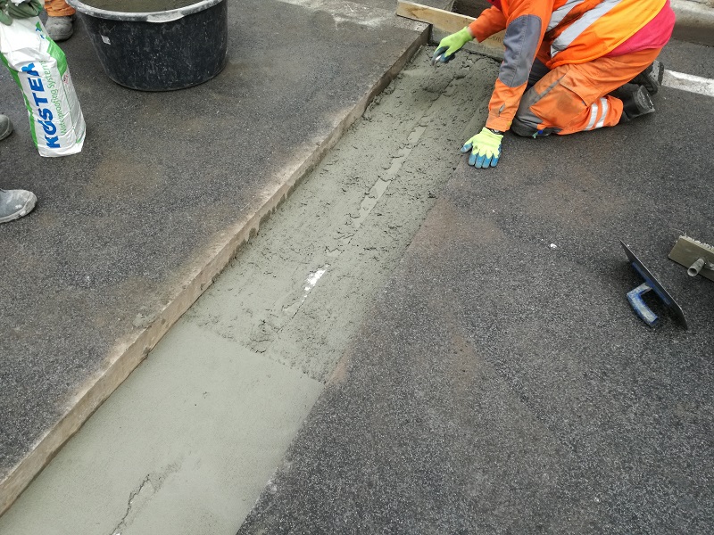 Izravnanje podloge brzoveznim mikroarmiranim mortom (KÖSTER Reparaturni Mort Plus) prije ugradnje elastične bitumenske prijelazne naprave. Mort karakterizira kompenzirano skupljanje, brzoveznost i vodonepropusnost. Može se nanijeti u jednom sloju u debljinama 4 - 50 mm.