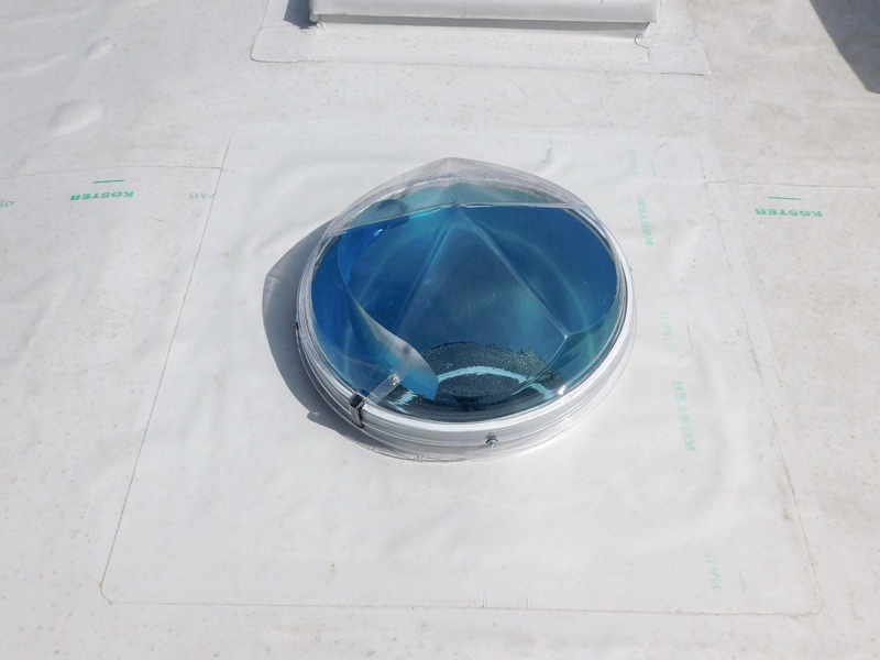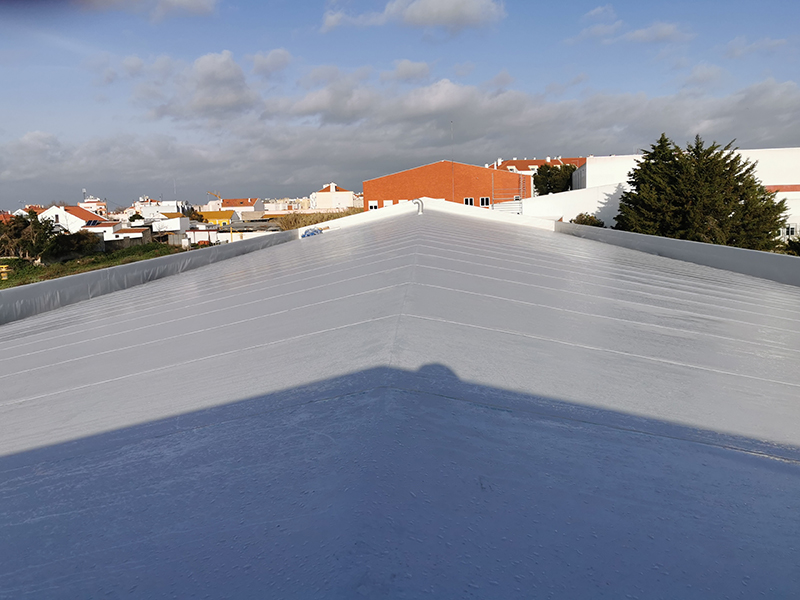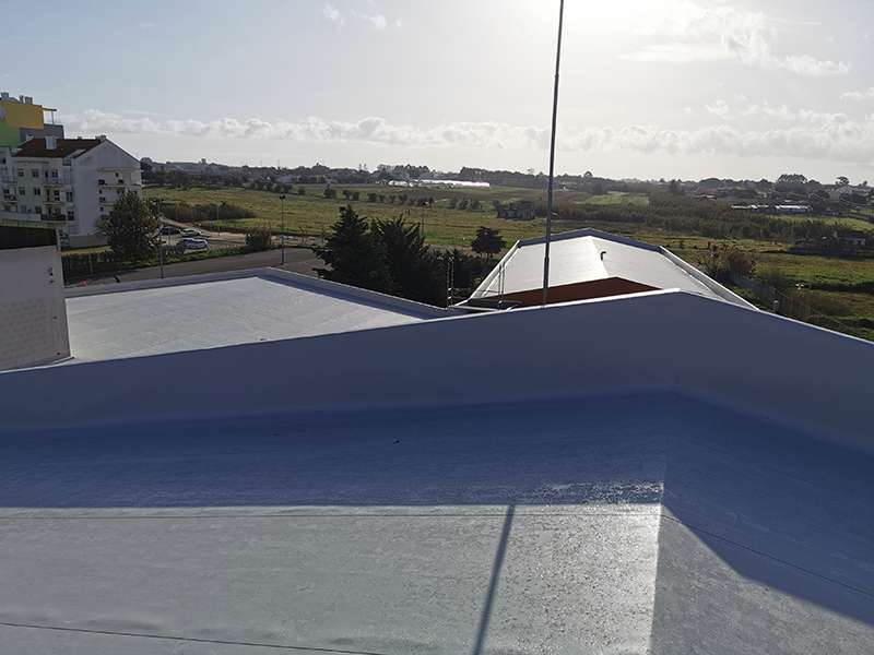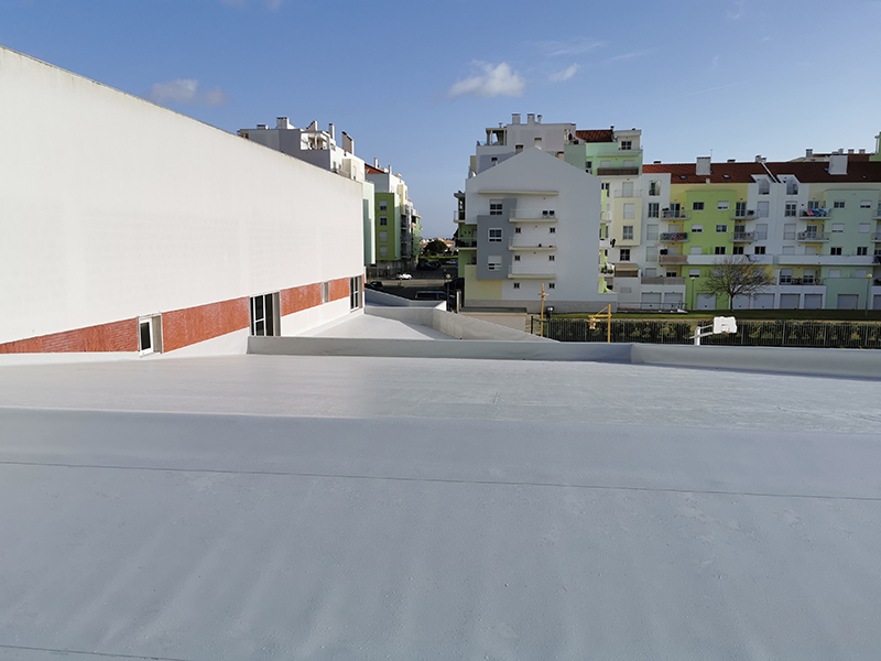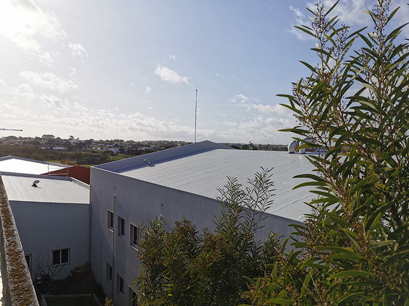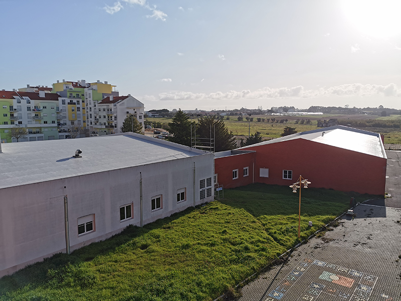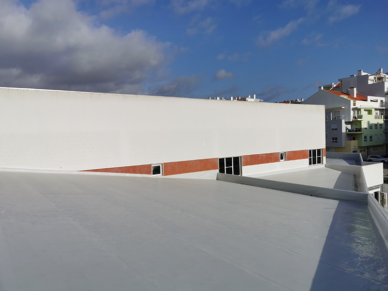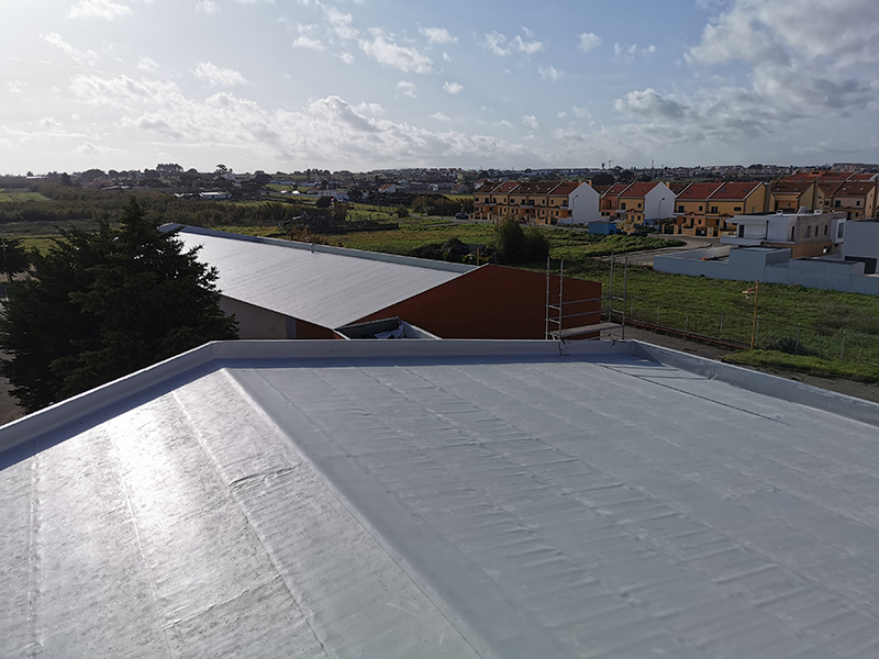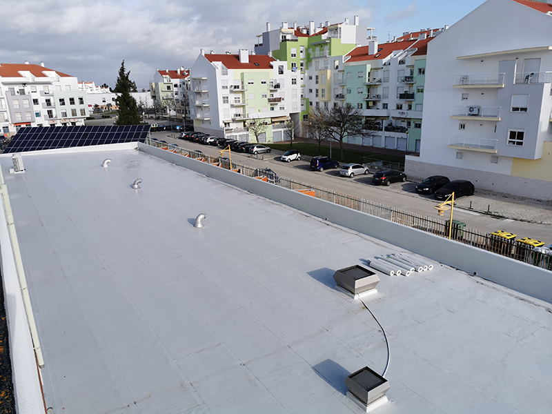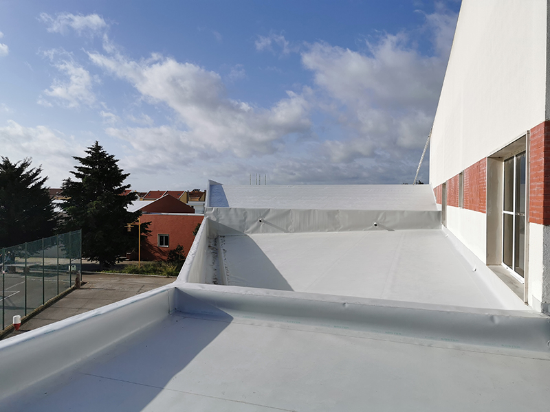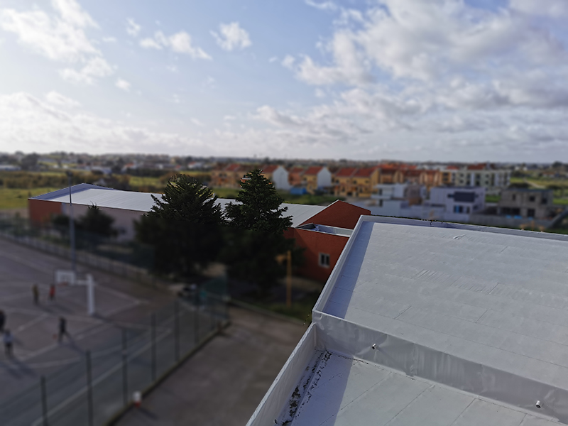 5000 m² roof of high school in Alcochete, Portugal done with KÖSTER TPO membranes applied using mechanical fastening system over concrete slab. KÖSTER accessories and details applied where needed.
