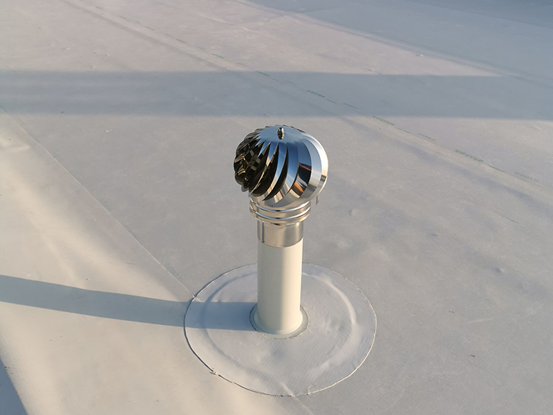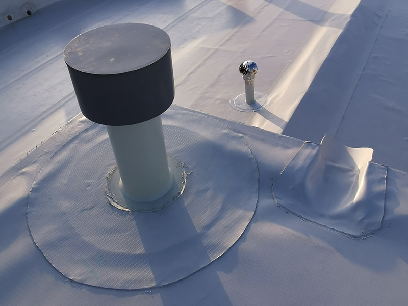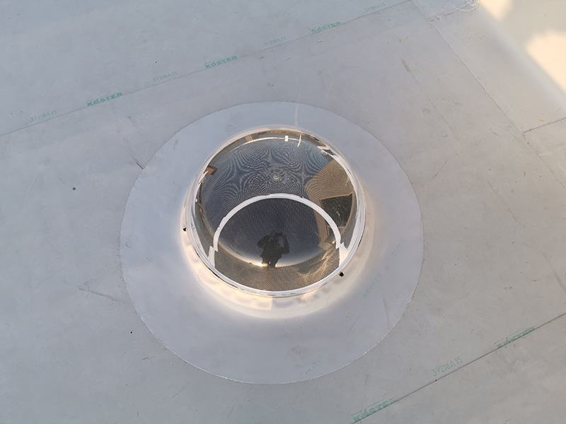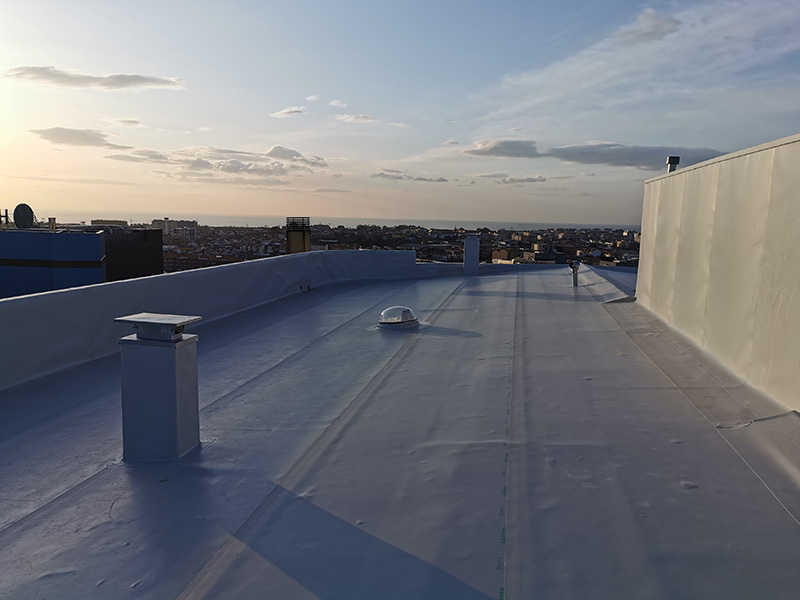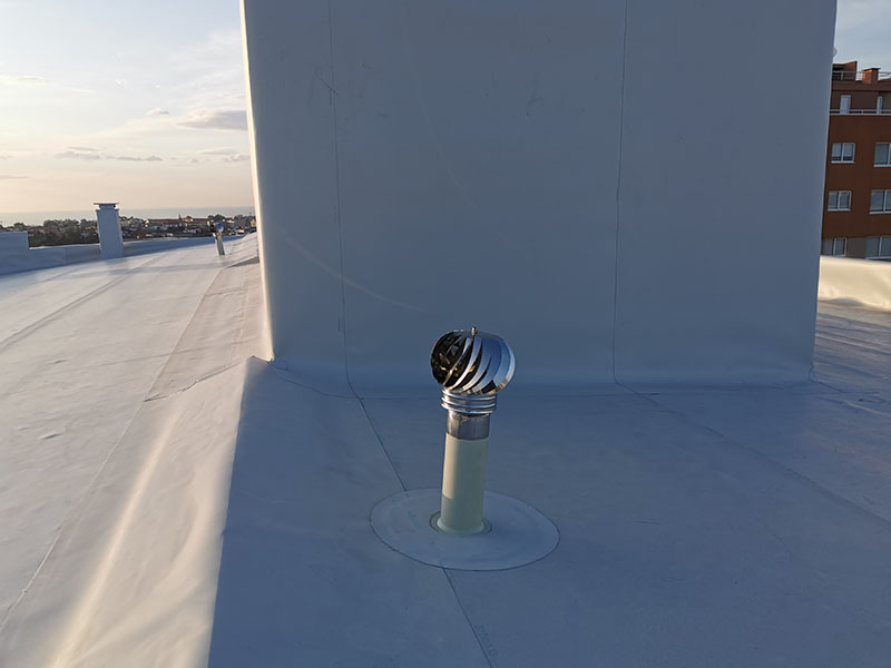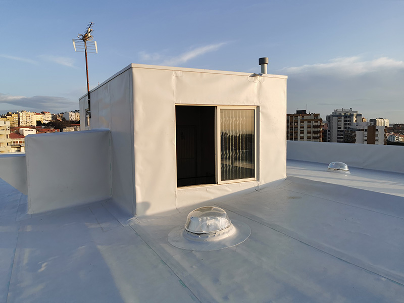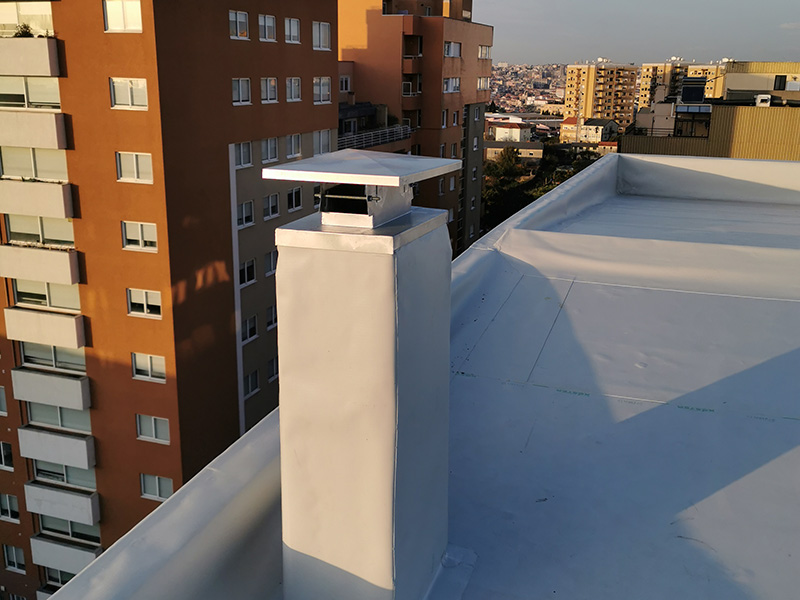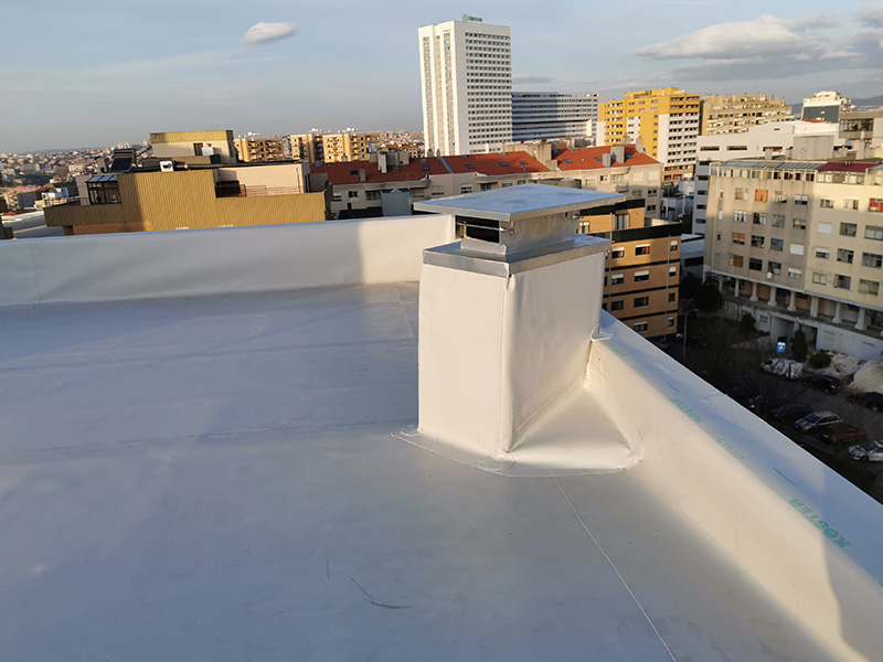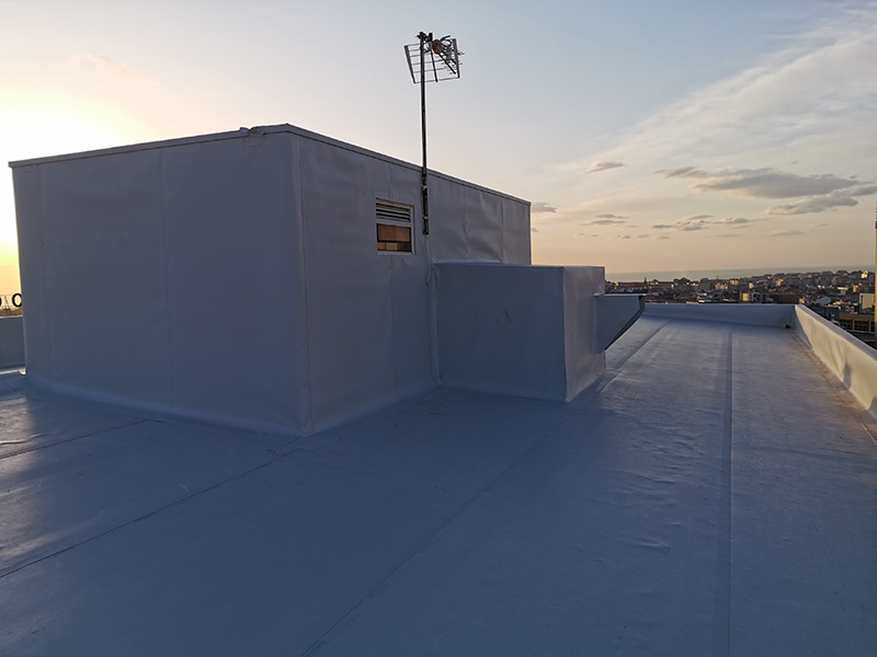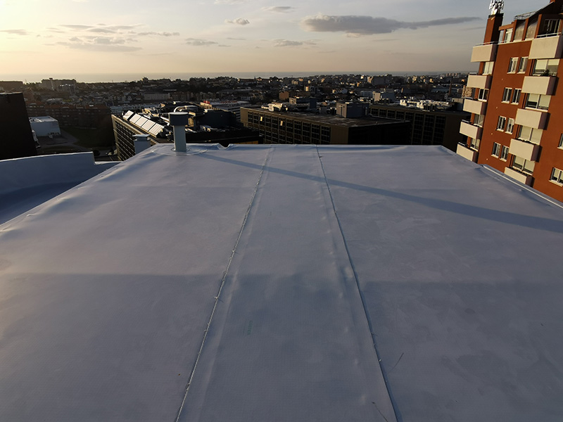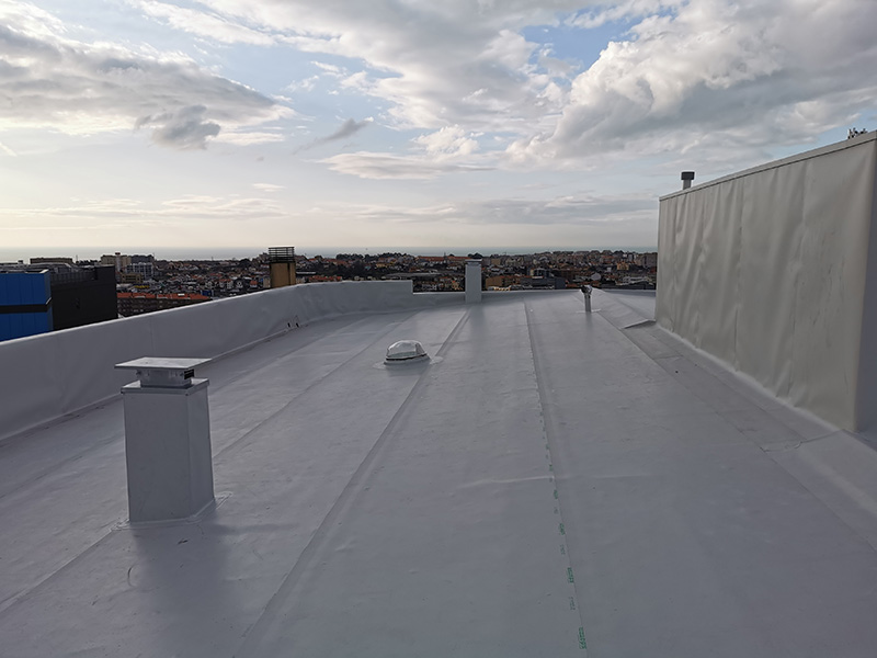500 m² old fiber-cement roof rehabilitation with KÖSTER TPO membranes applied by strip adhesion with PUR adhesive on top of PIR insulation boards mechanically attached. KÖSTER accessories and details applied where needed.