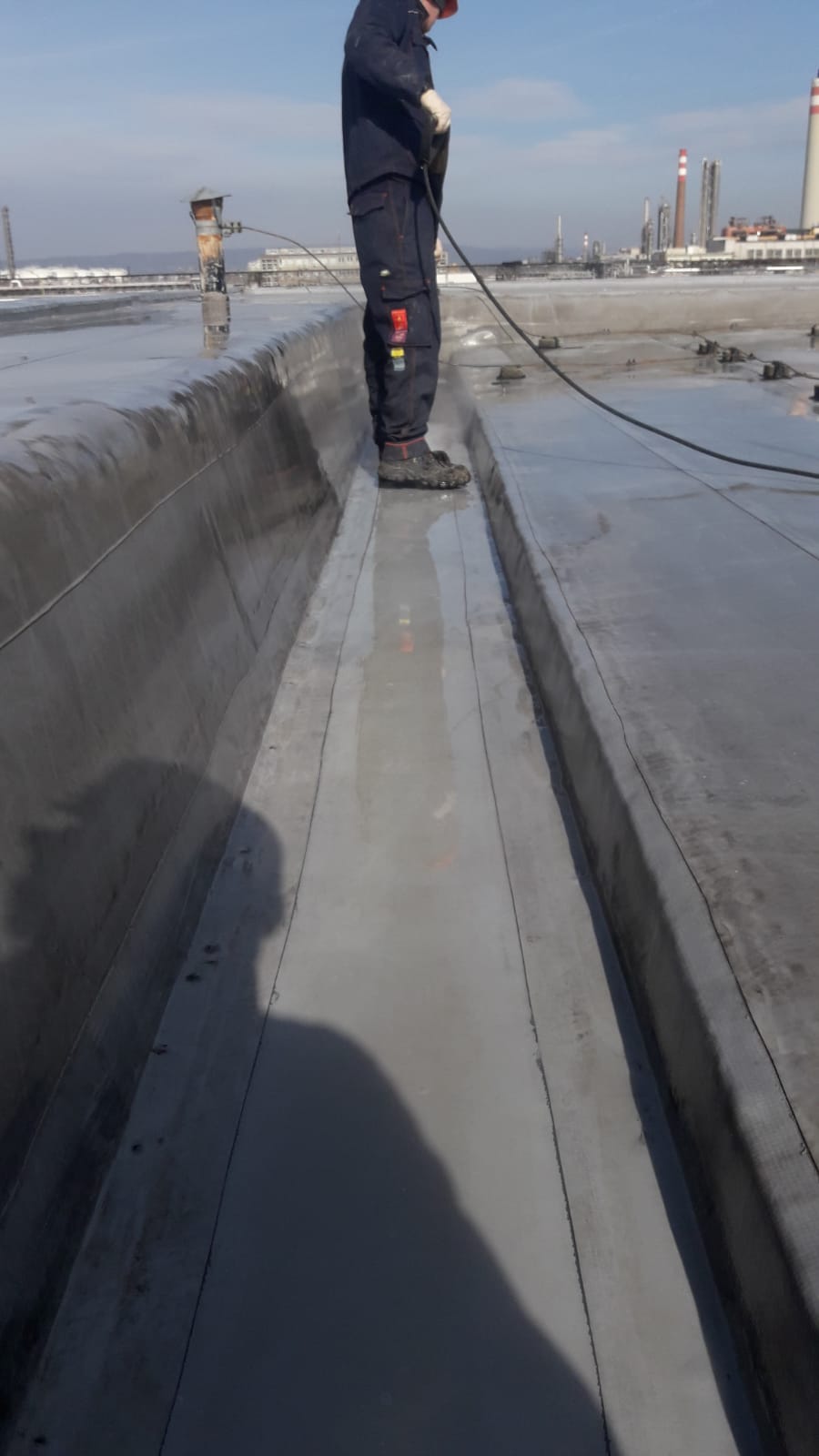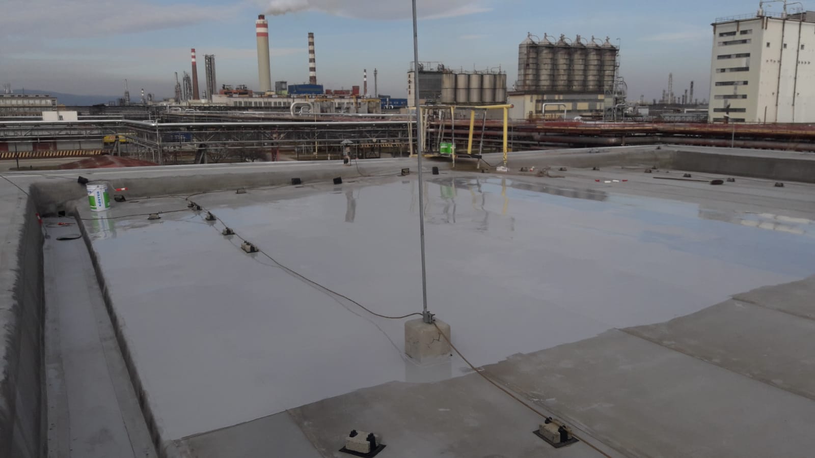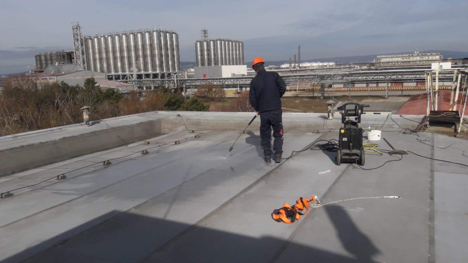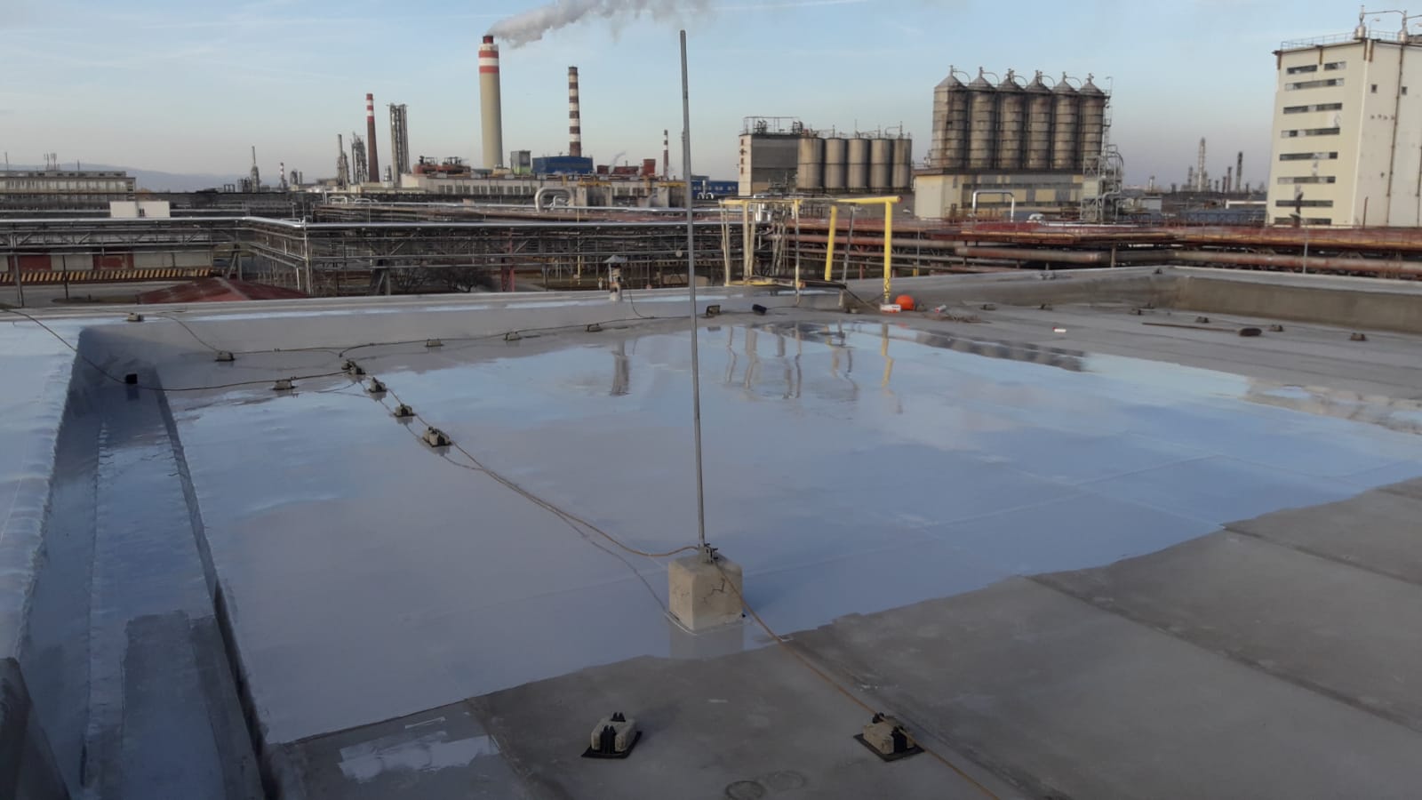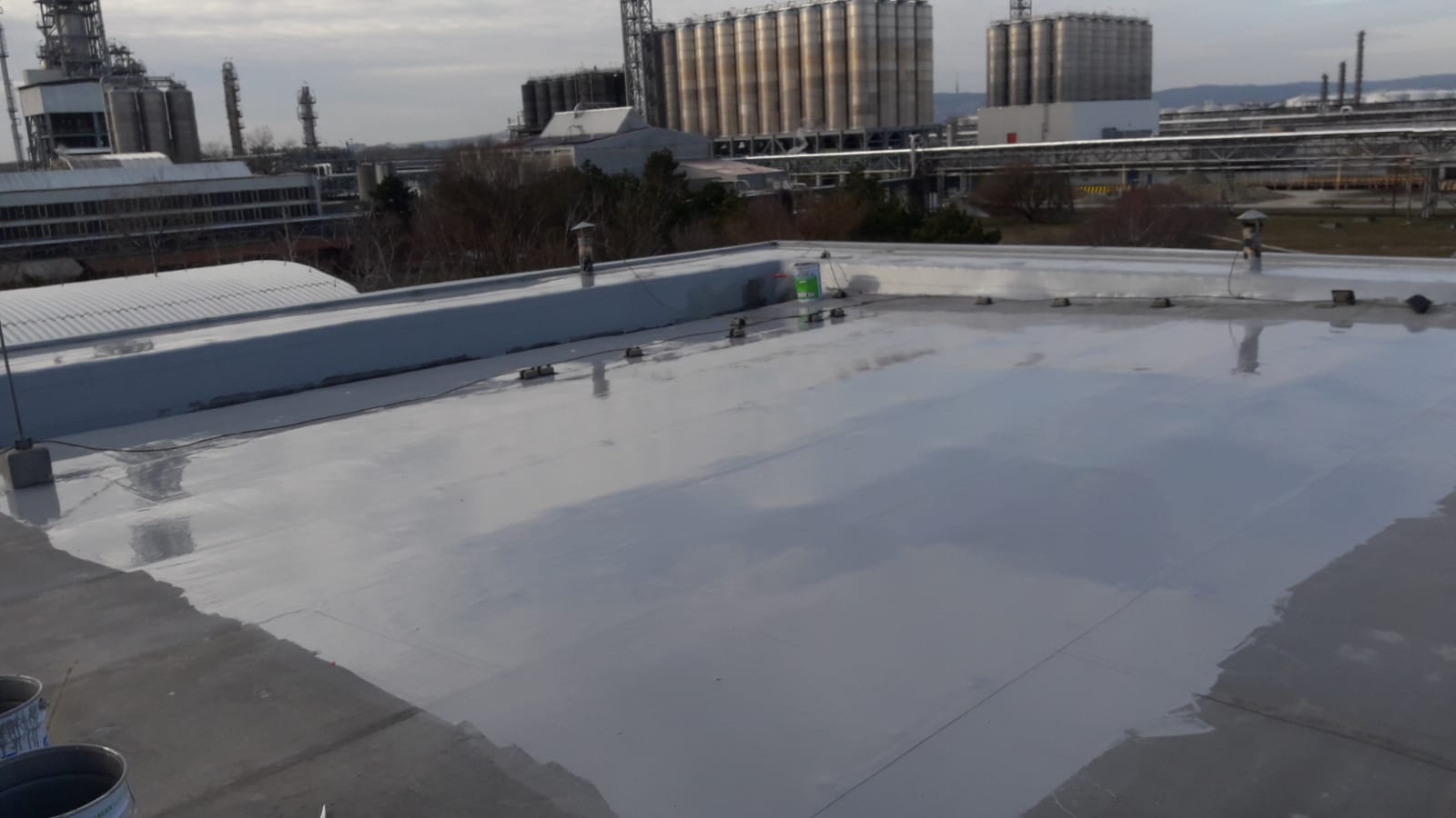 Zákazník potreboval rýchlu opravu strechy pokrytej staršou PVC fóliou. Povrch bol očistený vysokotlakovou vodou a saponátom, aplikoval dvojnásobný náter tekutou fóliou KÖSTER MS Flex Folie. Do rohov na styku stena/podlaha medzi dva nátery sa vložila výstužná sieťka KÖSTER Glass Fiber Mesh.