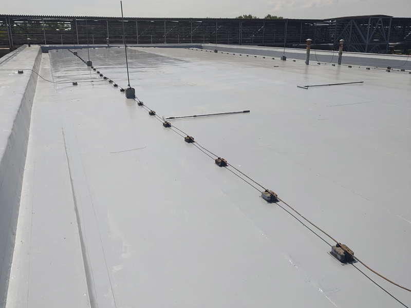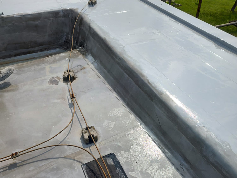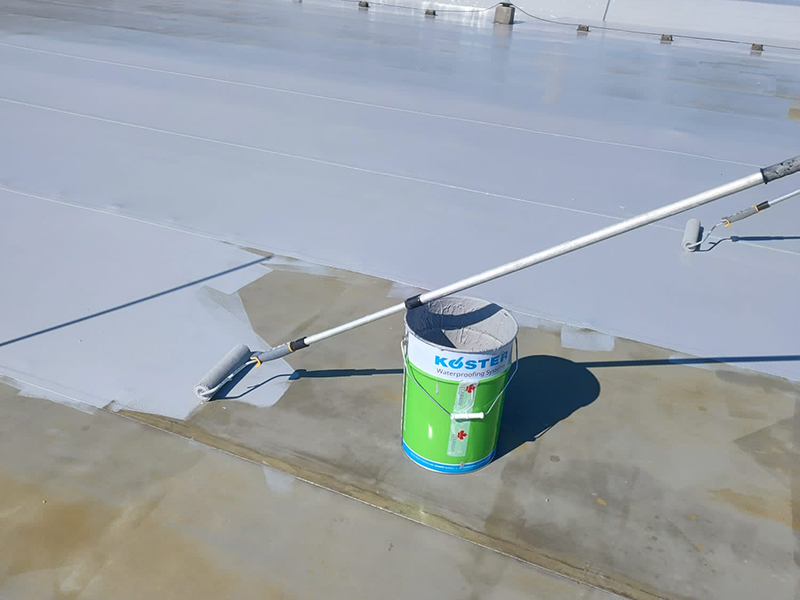 The surface of the foil was washed free of dust and dirt to increase the adhesion of the new coating with pressure water and allowed to dry completely. In the next step, the primer was applied with a roller. After the primer had dried, the first waterproofing layer was applied with a rubber trowel or roller. Details, penetrations, corners and corners were painted with a brush to get the coating everywhere. If the foil was damaged, torn or visibly leaking, this area was reinforced with reinforcing fabric in the first coat of KÖSTER MS Flex Foil. A second coat was also applied within a maximum of 48 hours to ensure that the coatings were properly bonded together. This repair created a new waterproofing layer on top of the old foil, extending the life and waterproofing of the base layer.