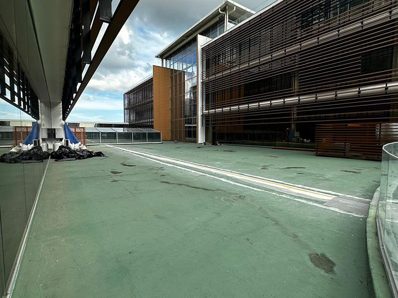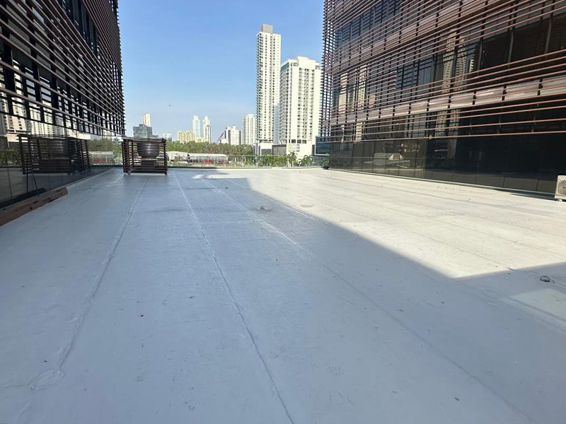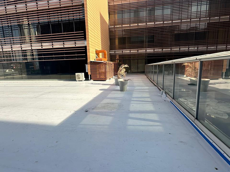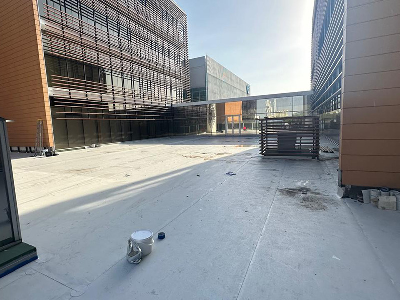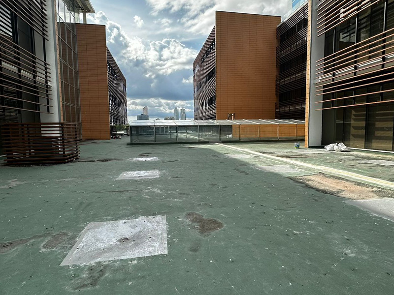 Concrete slab with multiple cracks, expansion joints, water puddles, and leakage issues was renovated with KÖSTER TPO.