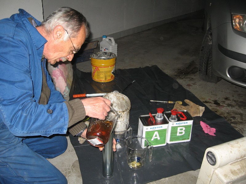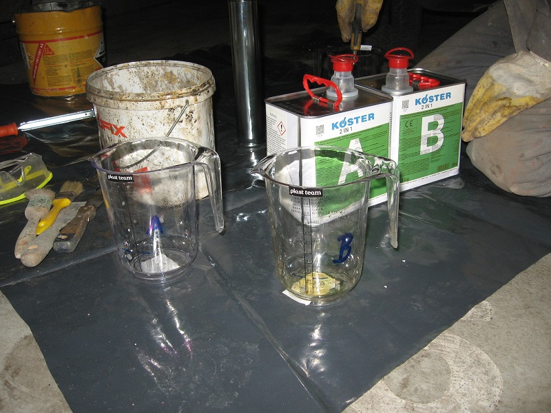 Sanacija betonske konstrukcije injektiranjem 2K PU smole KÖSTER 2 IN 1. Ukoliko smola dođe u dodir s vodom trenutno bubri u elastičnu pjenu (volumenski ekpandira do 20 puta), a ukoliko ne dođe u kontakt s vodom ostaje u obliku elastične smole.