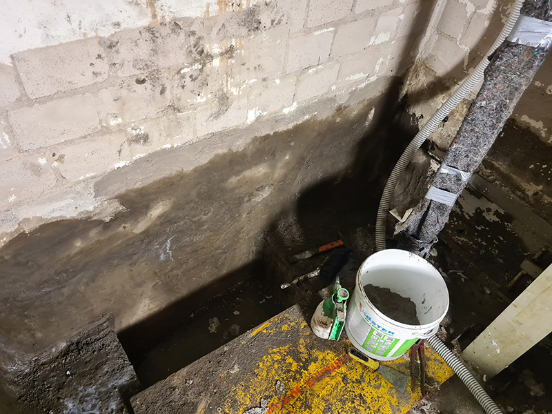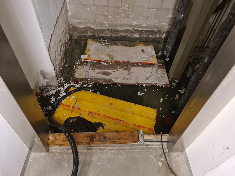 Problem: Immer wieder eindringendes aufsteigendes Wasser, welches unkontrolliert in den Fahrstuhlschacht der Behörde der Landeshauptstadt Kiel fließt. Die erste Maßnahme war es, das eindringende Wasser mit KÖSTER KD 2 Blitzpulver zu stoppen. Danach wurden an verschiedenen Stellen Injektionen mit KÖSTER 2 IN 1 durchgeführt und mit KÖSTER Sperrmörtel WU mineralisch abgedichtet. Eine Bodenbeschichtung mit KÖSTER CT 215 Universal Floor rundet die Baustelle fachmännisch und optisch ab.