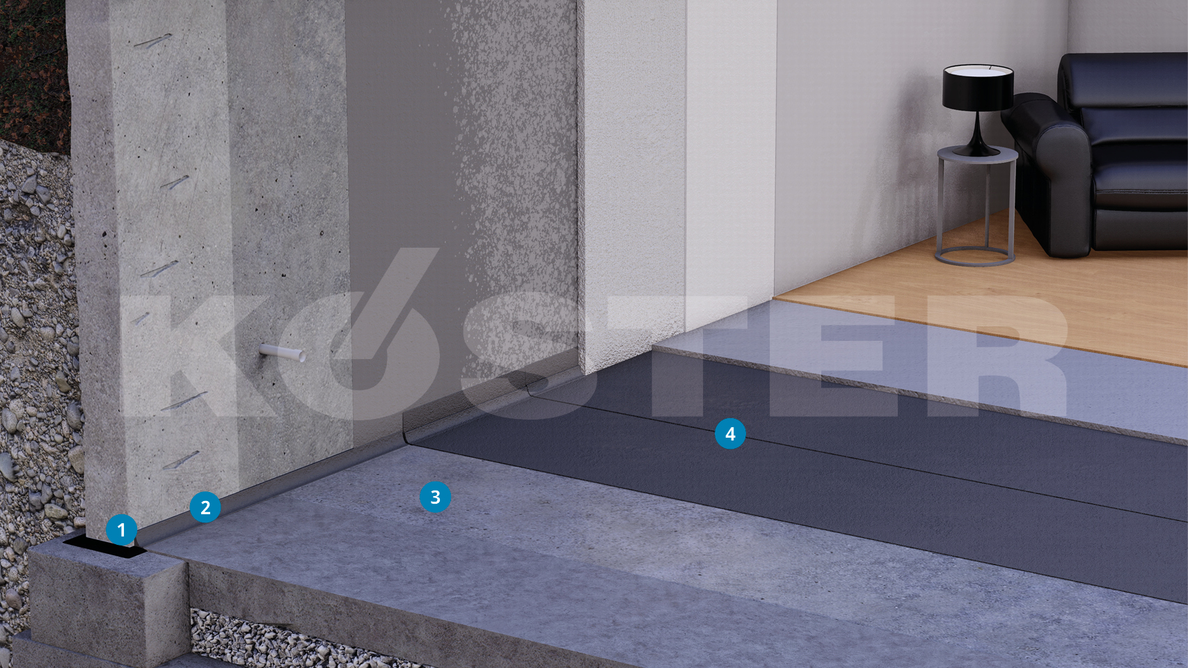 Fladetætningen sker standardmæssigt med KÖSTER NB Tætningssvumme 1 grå (blandet med KÖSTER NB 1 Flex). Skal det gå særligt hurtigt, anvendes KÖSTER NB 1 "hurtig". Hvis der trænger trykkende vand op gennem gulvpladen, skal der tætnes i henhold til KÖSTER Kældertæt-metoden. Som overfladebeskyttelse er det derefter ideelt at anvende KÖSTER SL Premium